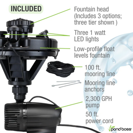Includes 2,300 GPH pump, 100 ft. mooring line, 3 fountain heads, three 1 watt LED lights, and dusk-to-dawn sensor