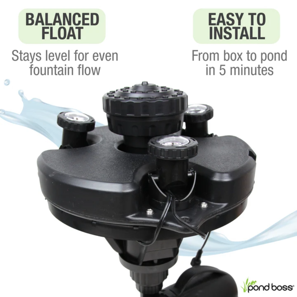 POWERFUL & COMPACT — 1/4 HP (horsepower) fountain with low-profile float design that remains balanced for easy upright positioning in water