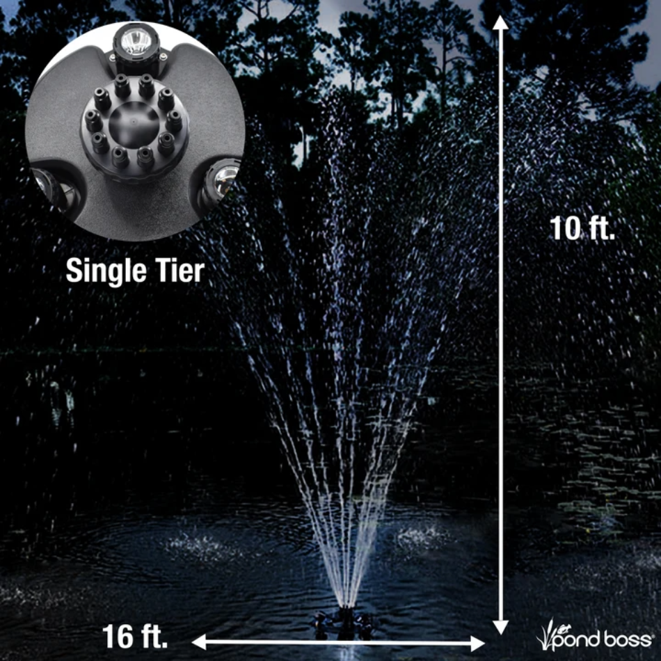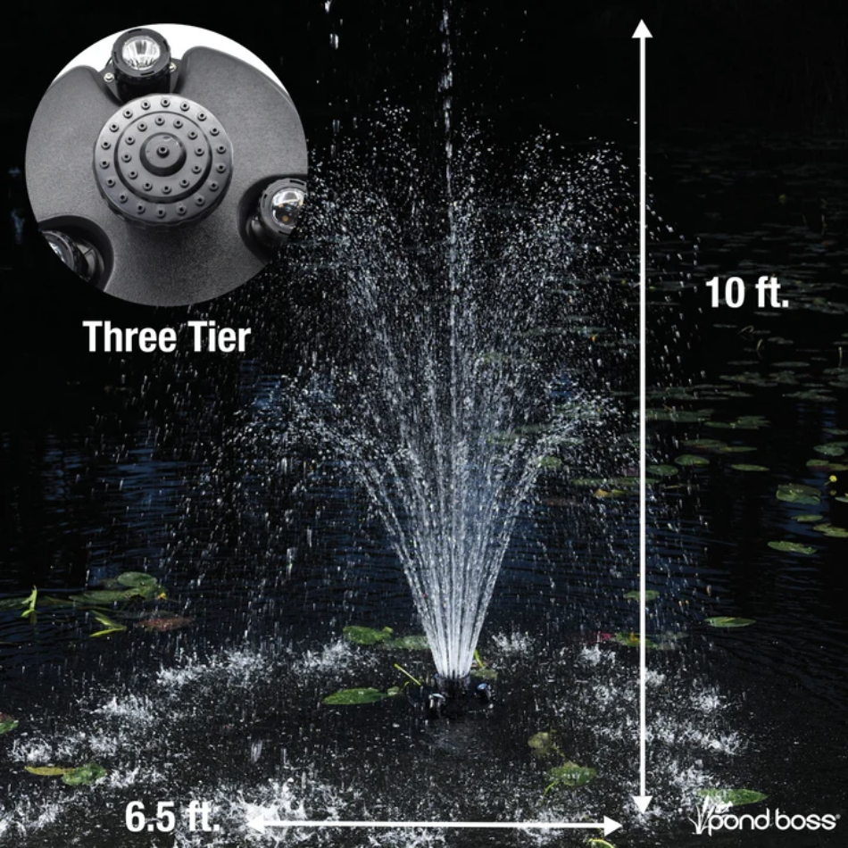 BEAUTIFUL WATER EFFECTS – includes three nozzle heads for a variety of spray patterns that not only dazzle, but also add oxygen to the water. Choices included a single-tier, three-tier, and trumpet nozzles. Three low-voltage lights are included to illuminate the fountain spray.