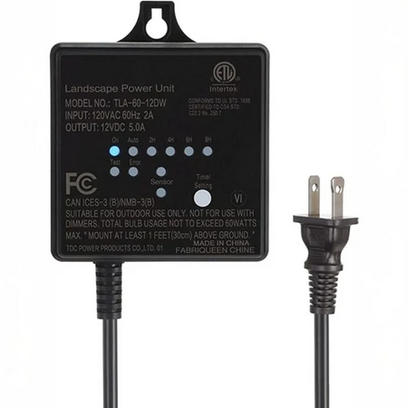 60 Watt transformer with Photocell. Includes splitter with quick connect or forked connections. Photocell includes timer with settings for dusk till dawn, 2, 4, 6, or 8 hours.