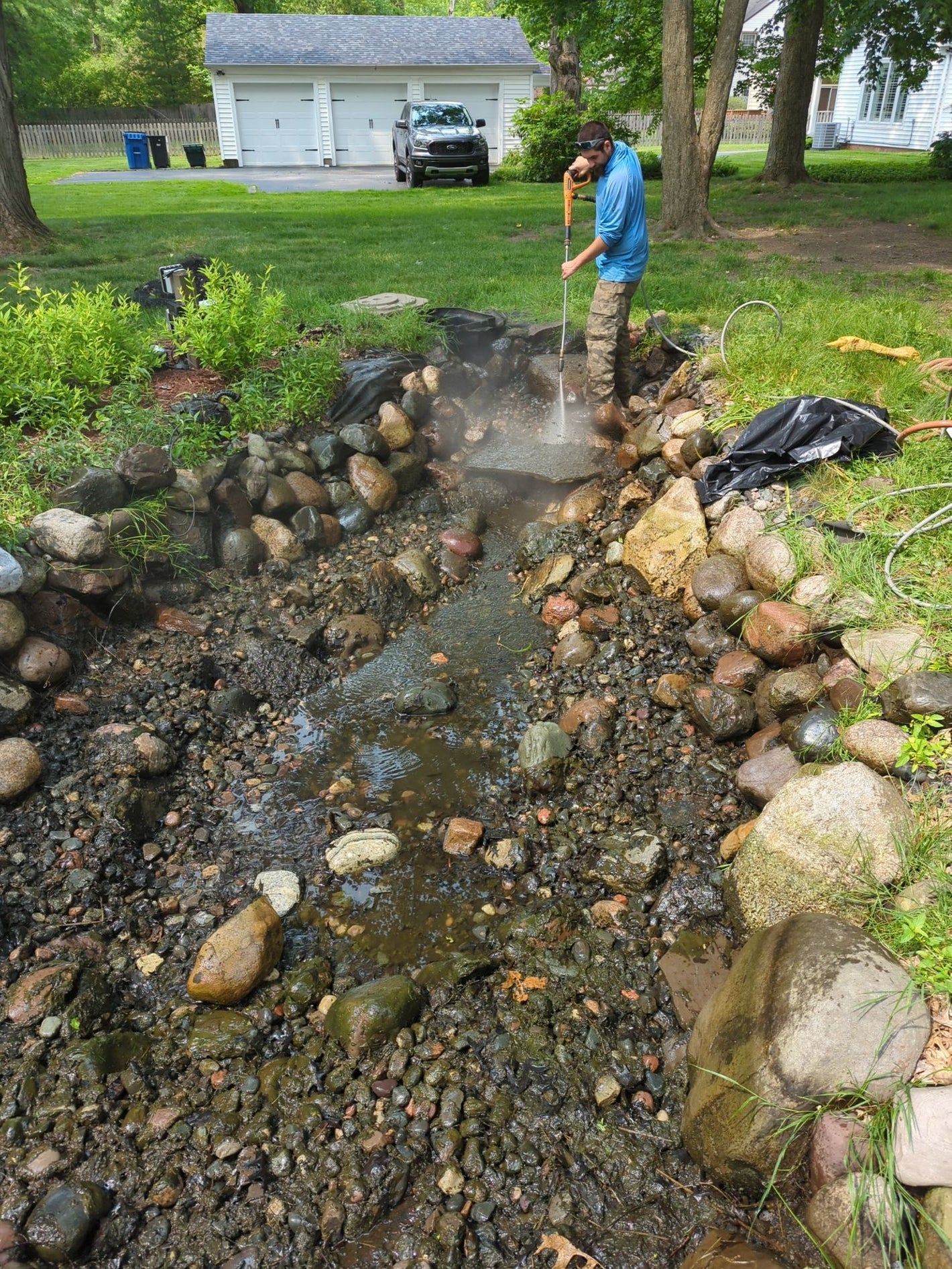 Draining and rinsing or power washing the pond