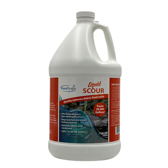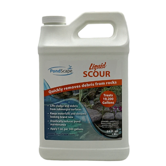 HOW TO APPLY: Use 1 oz. per 300 gallons of water. Turn off pumps when treating streams or waterfalls. Use 1 ounce of Liquid Scour for every 300 gallons of water. Can be applied directly to the pond. Product can be mixed in a bucket of pond water to evenly spread around pond or fountain. For best results apply in the morning under sunny, calm conditions. Applications can be repeated every 3 days until desired results are achieved. Ensure pond is equipped with a mechanical skimming device or remove the excess debris with a fine net the next day after treatment.
