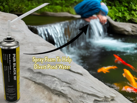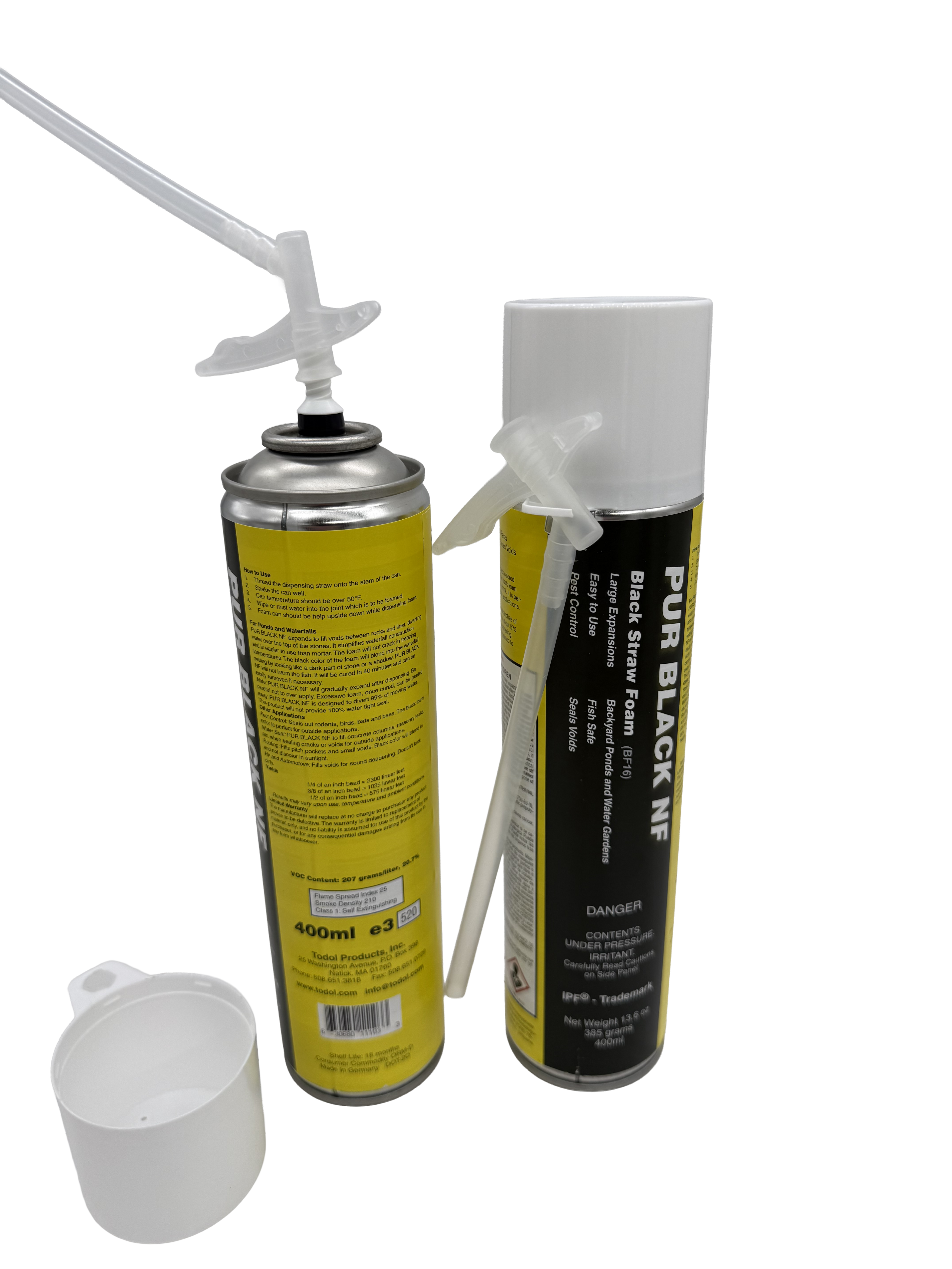 A: Regular construction foam cures to tan or yellow, making it highly visible in pond applications. PUR Black NF is specifically formulated for water features with a black color, superior UV resistance, and fish-safe formulation once cured.