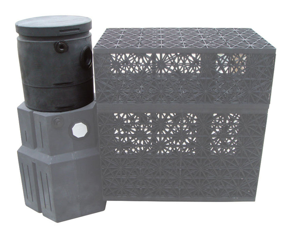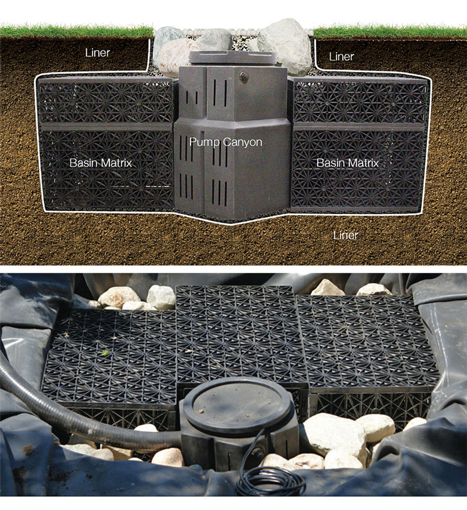 Step 2. Install Underliner first, then Rubber Liner. Place Pump Canyon® and Matrix Boxes on top of the liner. Backfill outside the lined basin area.