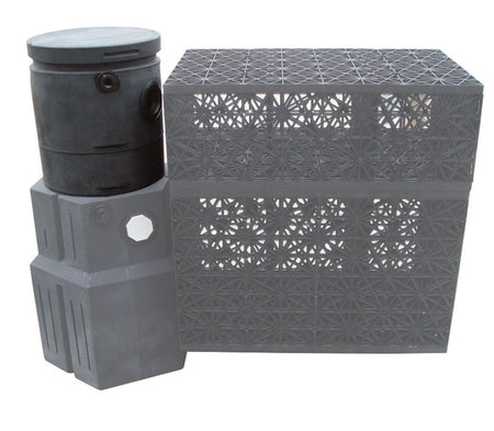 After digging a basin and installing our Basin Matrix & Liner, it's simple to install the Pump & Check Valve Assembly inside a Pump Canyon®. The pump pushes water through the PVC Flex Hose up to the Cascade Box. From there, water flows back into the lined basin and continues to recirculate