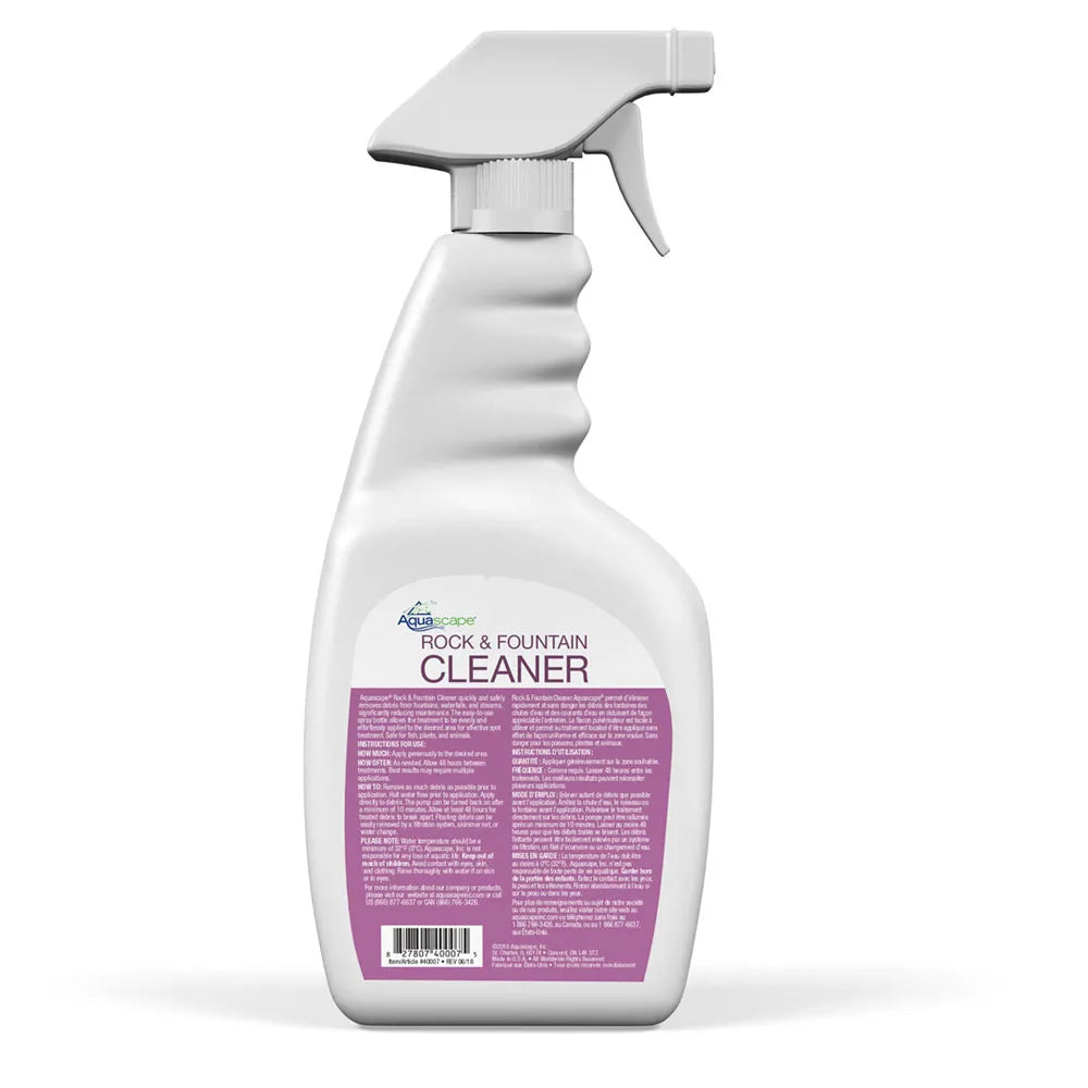 Aquascape Rock and Fountain Cleaner is the first line of defense to quickly and safely remove debris from waterfalls, streams and fountains, significantly reducing required maintenance. The innovative and easy-to-use spray bottle allows the treatment to be evenly and effortlessly applied to the desired surface for effective spot treatment. Simply halt water flow and apply the treatment to the desired area. The pump can be turned back on after a minimum of 10 to 20 minutes One bottle covers up to 300 square feet. Rock and Fountain Cleaner is safe for fish, plants, pets, and wildlife after use.