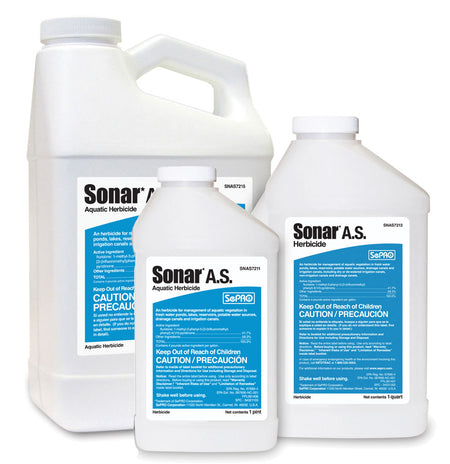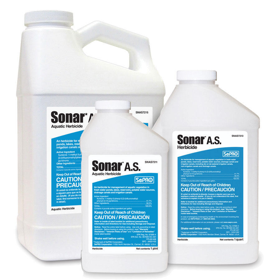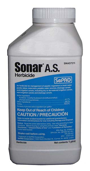 Sonar A.S. is designed for water bodies with minimal flow and offers whole pond or lake treatment. A wide range of aquatic weeds are controlled using Sonar A.S. with exception of algae species. This 41.7% Fluridone product is excellent for whole pond and lake treatments. Sonar A.S is a selective systemic aquatic herbicide for management of aquatic vegetation in fresh water ponds, lakes, reservoirs, drainage and irrigation canals. It is important to maintain the recommended concentration in contact with the target plants for a minimum of 45 days so application early in the season, prior to or just after plant growth begins, is best.